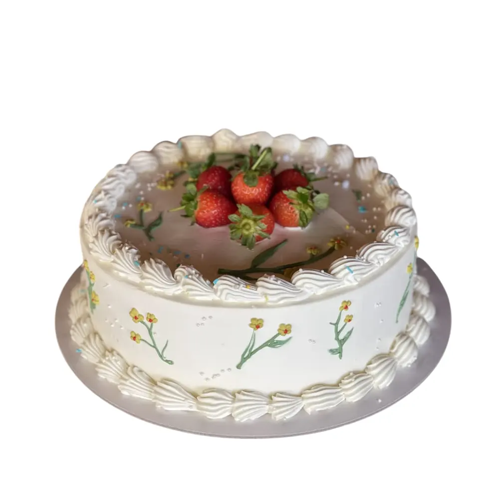 • Smooth cream cake topped with fresh strawberries and cream flowers