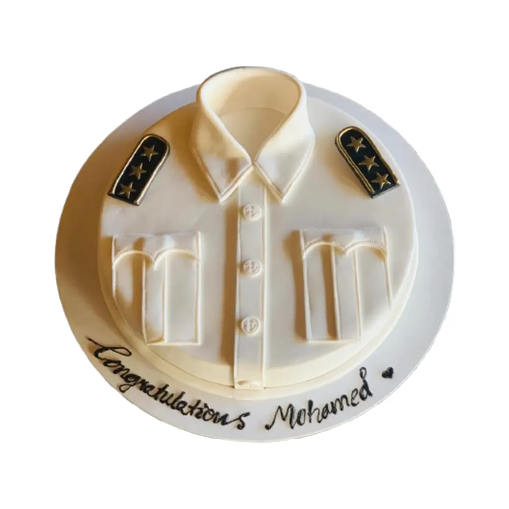 Celebrate success with this elegant uniform-themed graduation cake, inspired by UAE’s official ceremonial attire. Designed with precise fondant detailing including collar, buttons, and insignia elements, this cake brings a refined and prestigious look — perfect for honoring achievements and milestones.